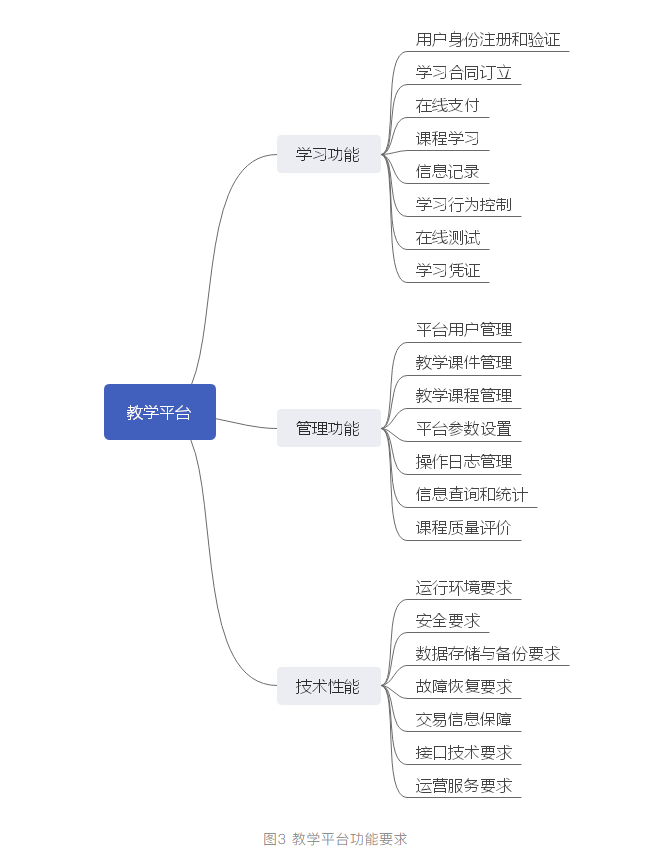 教学平台是开展和实施网络远程教学的软硬件基础,也是客观记录学习者学习过程信息的媒介,也是确保学习者在任何时间、任何地点都能在网络覆盖的区域进行学习,以突破时间和空间的限制。因此《技术规范》对教学平台的学习功能、管理功能和技术性能等方面提出相应的要求,如图2所示。